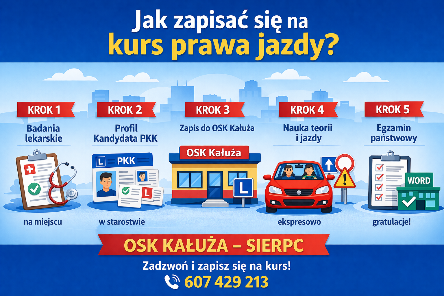 Możesz zapisać się w OSK Kałuża w Sierpcu — telefonicznie albo osobiście.